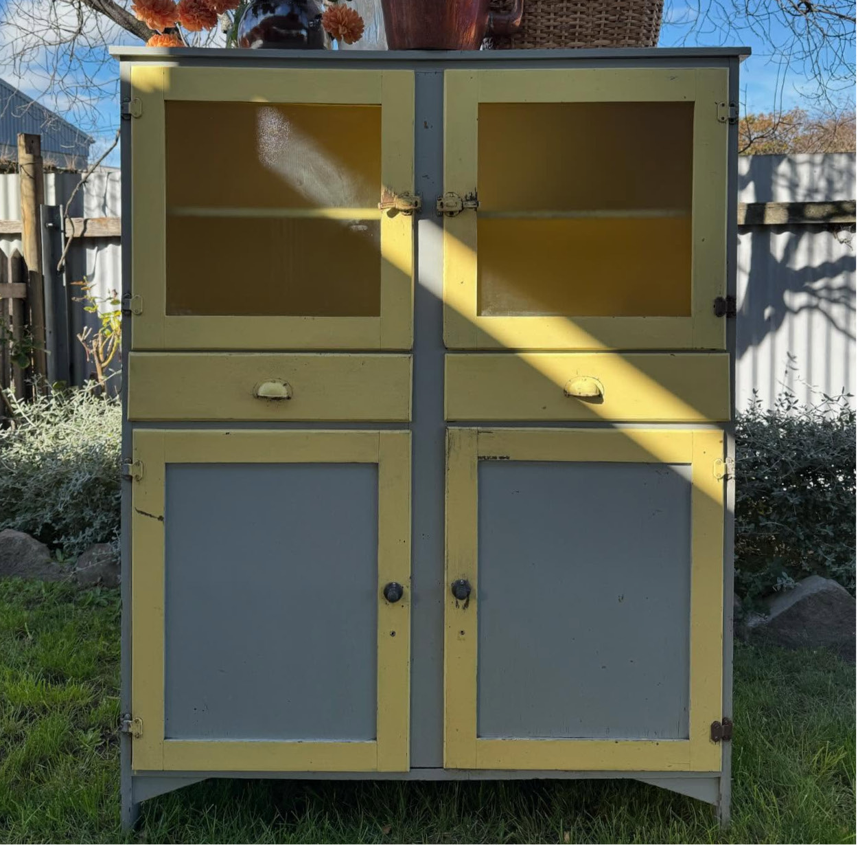 1940s painted oak kitchen pantry, in yellow and bluish grey this is sure to bring a pop of colour to the kitchen.