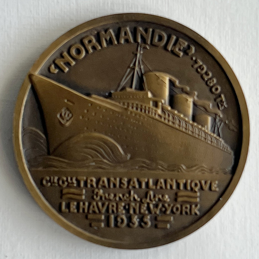 A bronze medallion commemorating the launch of the Compagnie Generale Transatlantique / The French Line’s luxury passenger ship, the S.S.Normandie in 1935.