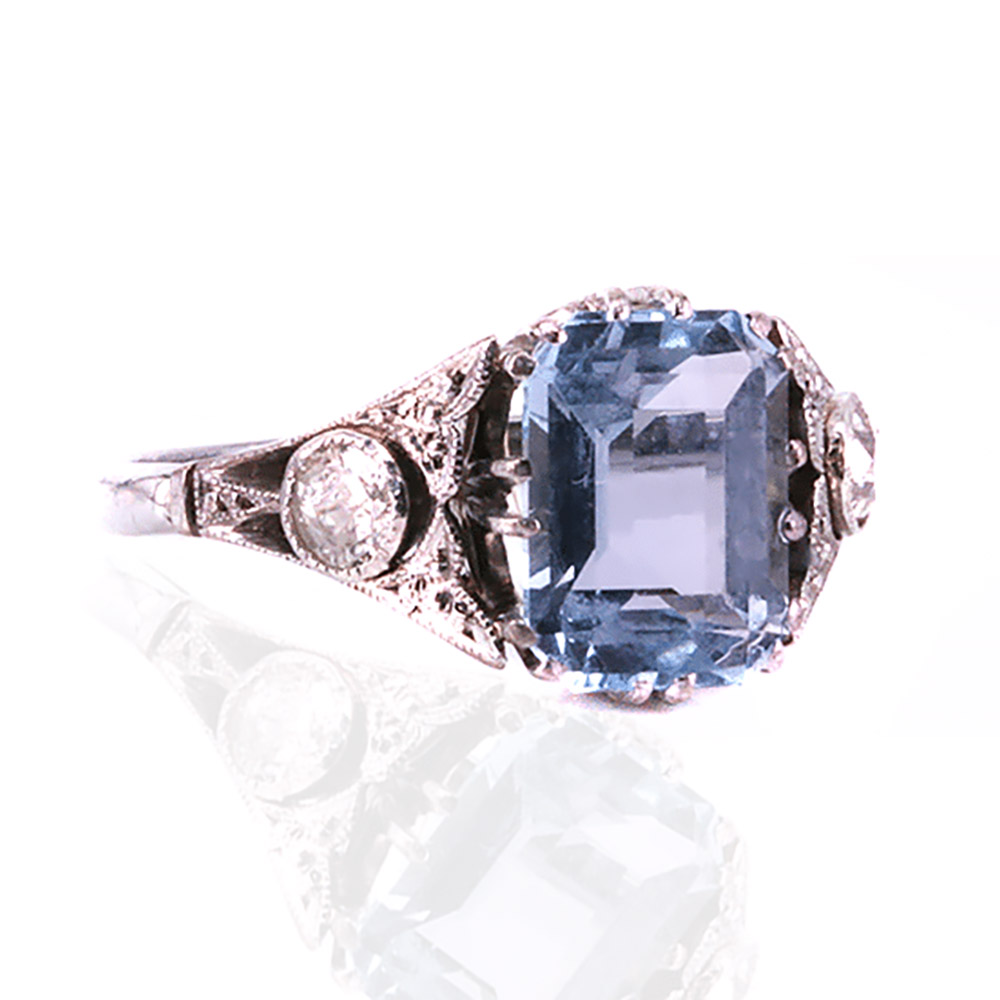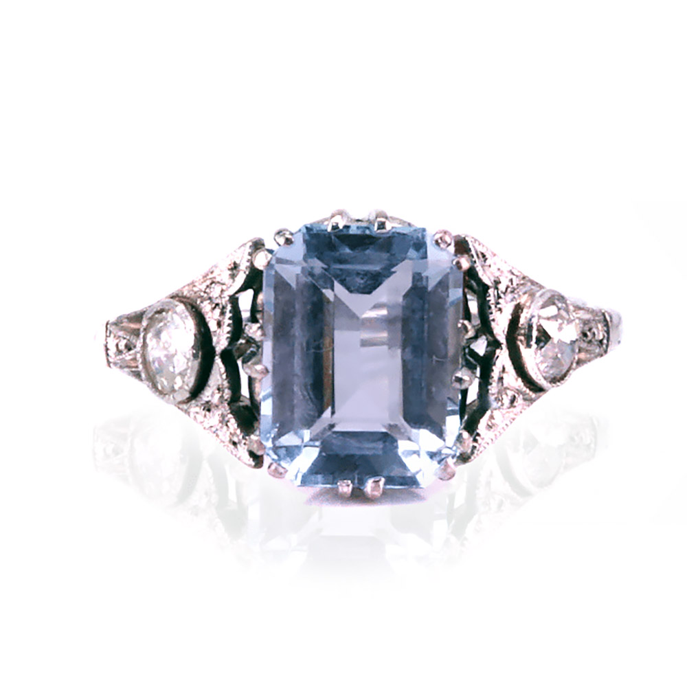 An Art Deco ring handmade in platinum in the 1920s, this aquamarine and diamond ring is as breathtaking and elegant today as when it was made.
