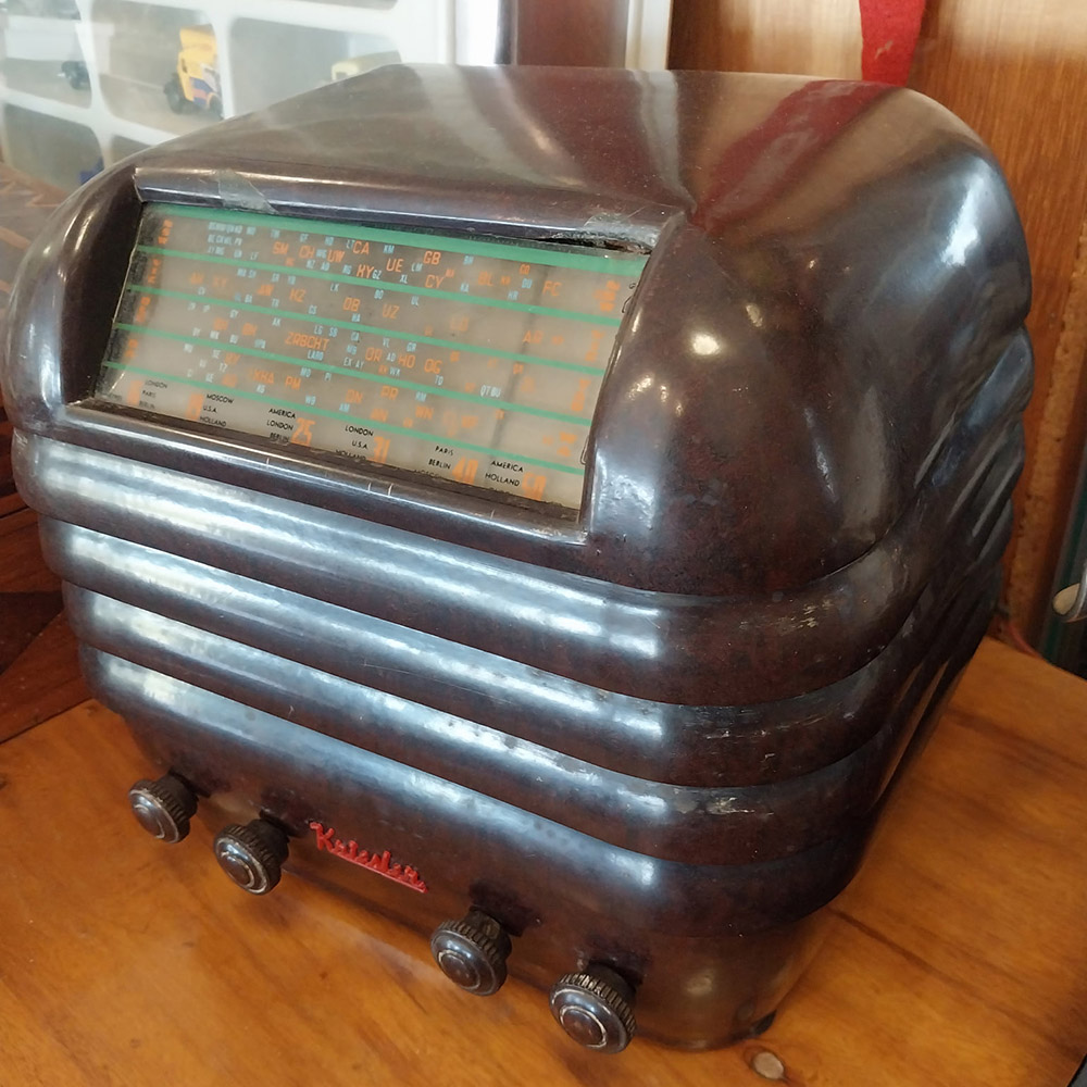 A lovely brown Bakelite radio in the Beehive shape, manufactured by the Kriesler Radio Company in Newton, Sydney with the case designed by renowned designer and architect Douglas Snelling, 1946-48.