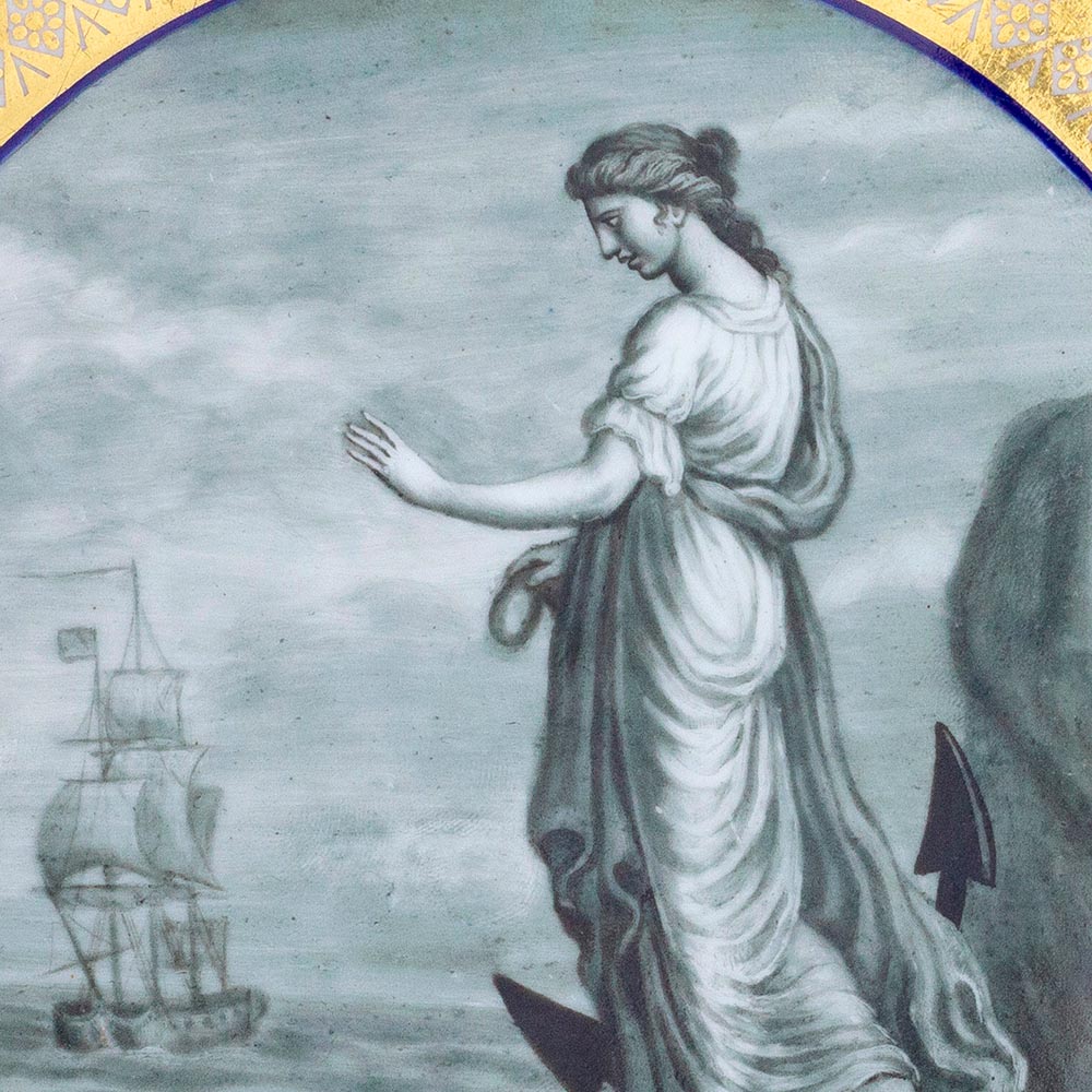 Across the set, Hope is depicted in a variety of poses with an anchor, and often with a ship in the distance. In this piece, Hope is standing on a rocky cliff at the sea’s edge, in front of her anchor, waving wistfully at a passing ship. Each centre depiction was hand-painted by John Pennington, stated as Royal Worcester’s finest artist.