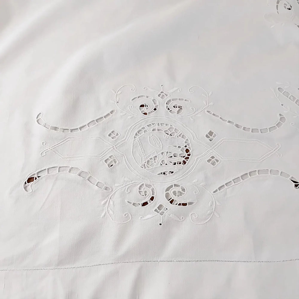 Vintage 1950s extra large white linen embroidered banquet tablecloth, 250cm x 165cm.