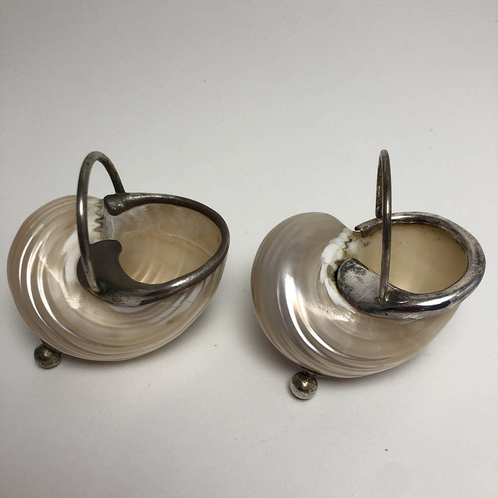 Rare and lovely pair of antique natural shell salt dishes, some loss to silver plating.