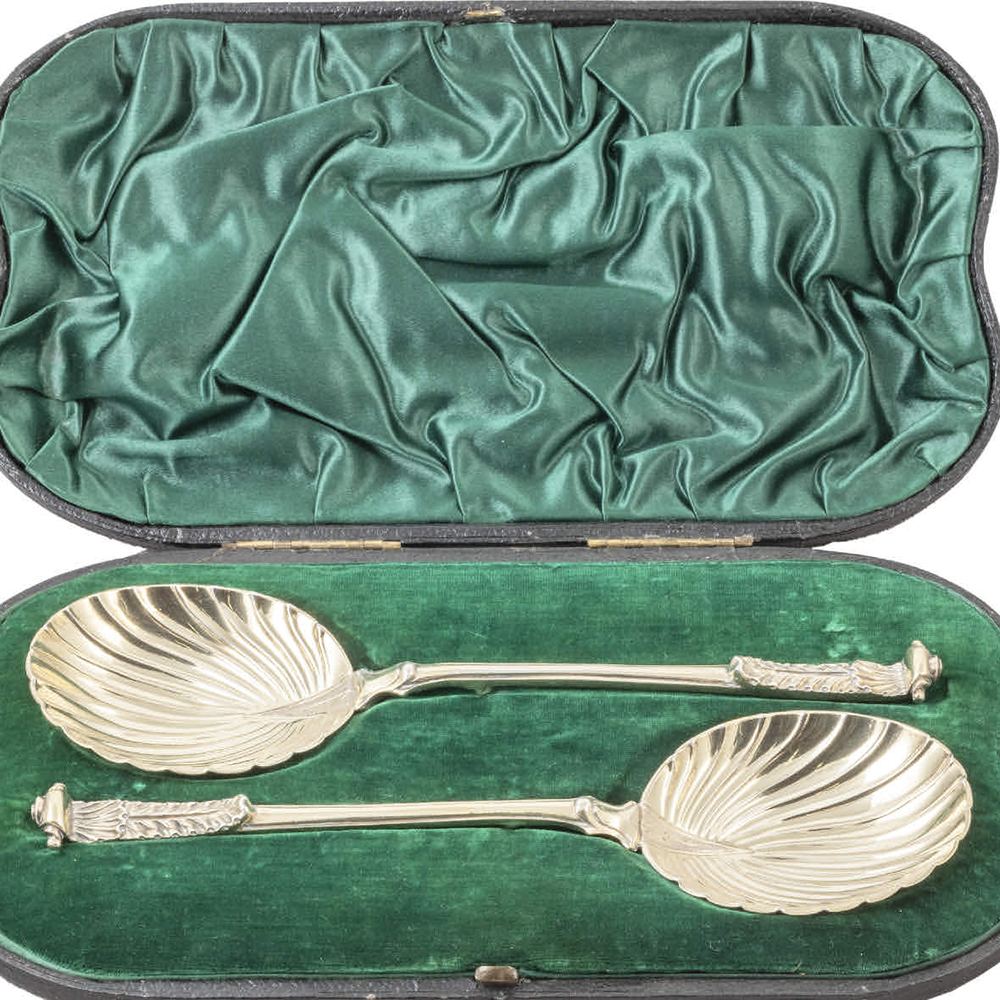Pair of late Victorian sterling silver serving spoons in original presentation box, gilt on sterling silver, with marks for Wakely & Wheeler, London, 1892.