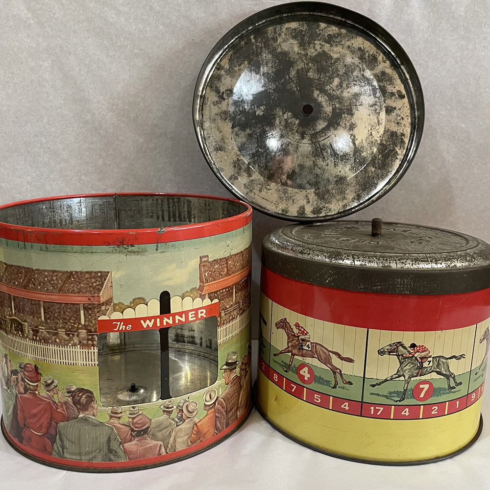 Peek Frean ‘Winner’ biscuit tin in excellent condition, c.1930s. The centre piece spins around when in place to choose the winner in a horse race.