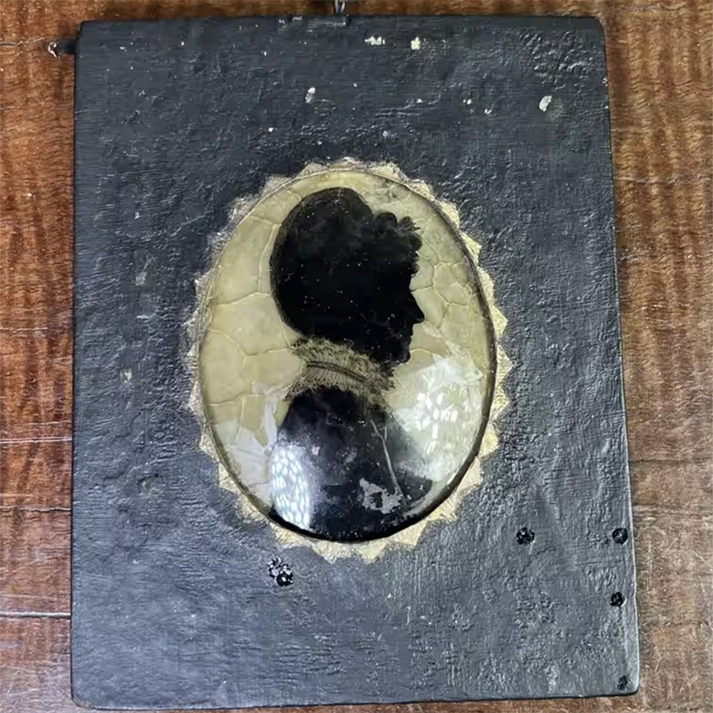 Portrait miniature of a lady, reverse painted onto a domed glass in black, with finely incised details, the background in white wax c.1785.