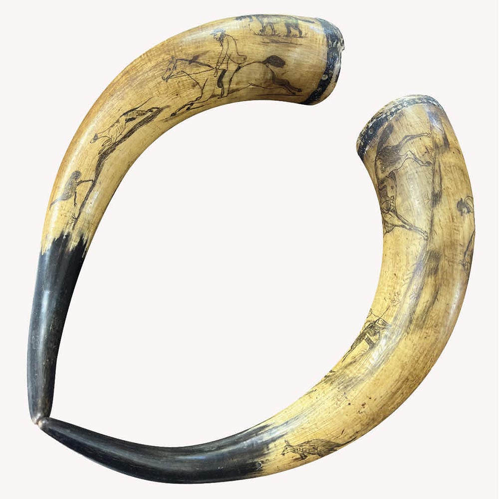 Great patina on this rare Australian pair of bullock horns, displaying the wild hunt of the emu and kangaroo by the Stockman of the land c.1850.