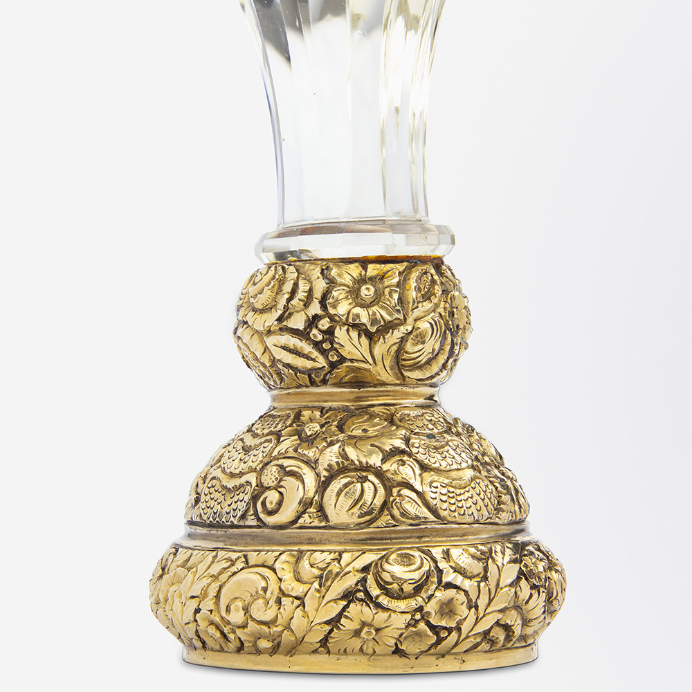 The handle of the piece is crafted from a piece of finely faceted and tapered citrine. The base of the seal is rendered in 18 karat yellow gold that could be described as ‘repousse’ in style, with a delicate floral motif throughout. This gold work encases the matrix of the seal, which has been left blank and comprises of a single piece of polished amethyst.
