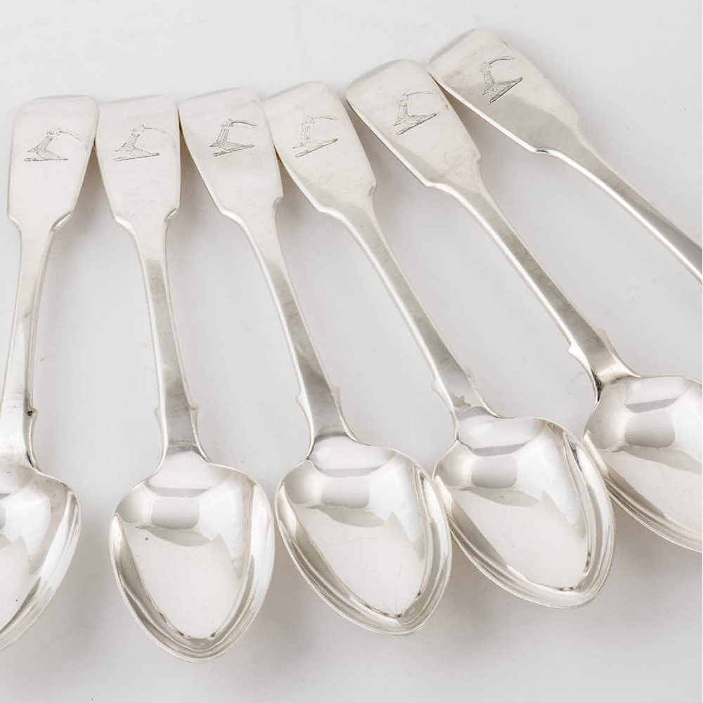 A lovely set of 6 early Victorian Irish silver spoons with marks for Dublin, 1839, Josiah Lowe. Crest belonging to the Earl of Aldborough, which was a title in the Peerage of Ireland, held by the Stratford family from 1777 until the title became extinct.