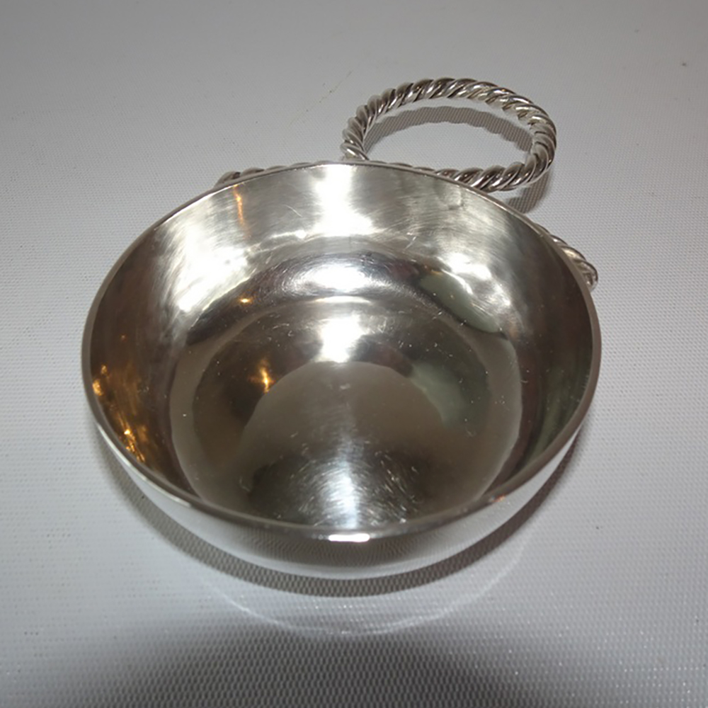 Measuring 11 cm x 7 cm, it features a shallow bowl with a twisted rope handle, echoing classic wine-tasting cups once used by sommeliers.