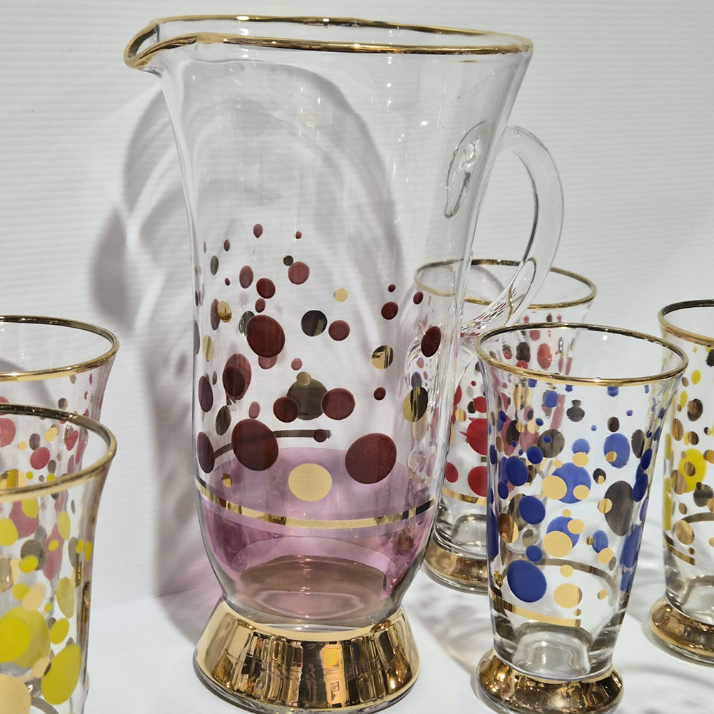 A vintage glass jug set with spotted decoration and gold highlights.