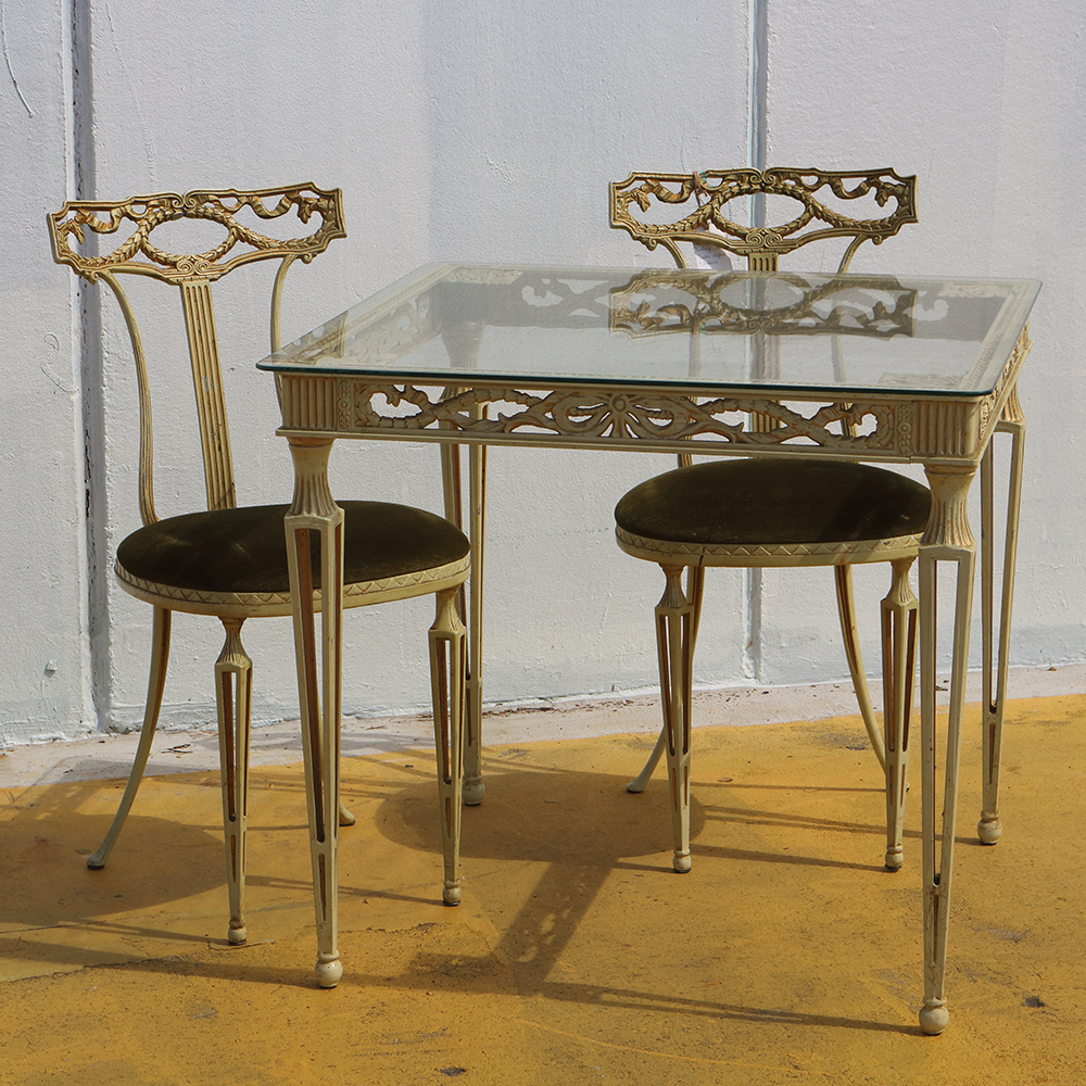 A three-piece Kentcast furniture setting of table with glass and chairs.