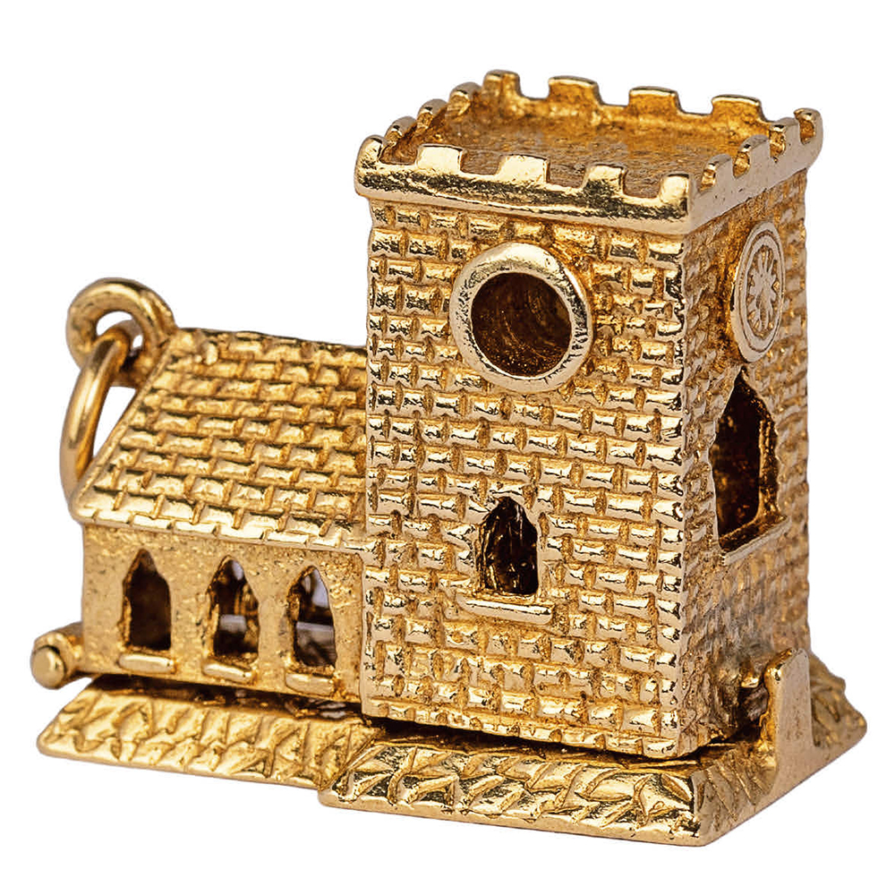 This truly special vintage yellow gold charm of a cathedral, featuring a wedding couple inside, is a timeless treasure that captures the romance and sentiment of a lifelong commitment.