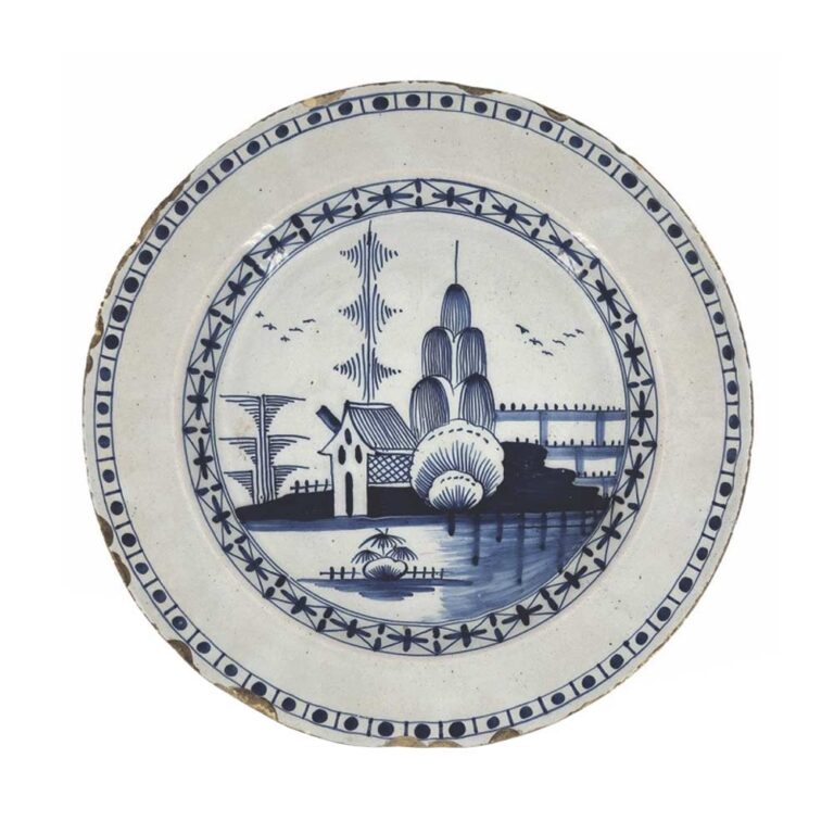 This charger is painted with a design of a house by a river. Lambeth, Abigail or William Griffiths. England, circa 1760.