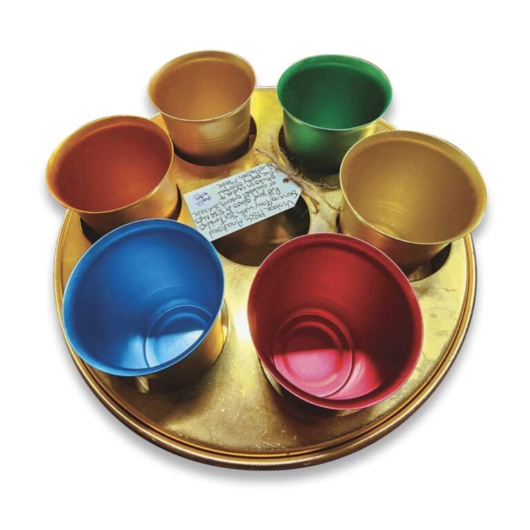 This circa 1980 bright multi-coloured retro anodised tray features a set of six tumblers in excellent condition.