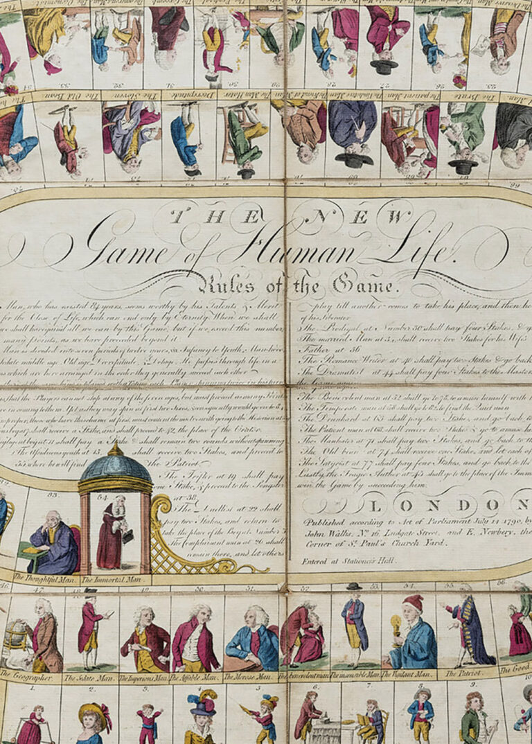 Wallis’s board games included another message for the young players, and it was this: knowledge could overcome chance. It was knowledge that determined the winner in his games and playing them successfully depended largely on the commitment of the player and their ability to learn. Children who played were expected to be ‘industrious, obedient, constantly respectful … never too spoilt, occasionally indulged as a reward for virtue.’ They were even encouraged while playing to use familiar objects around the home to personally test the scientific notions they were learning.