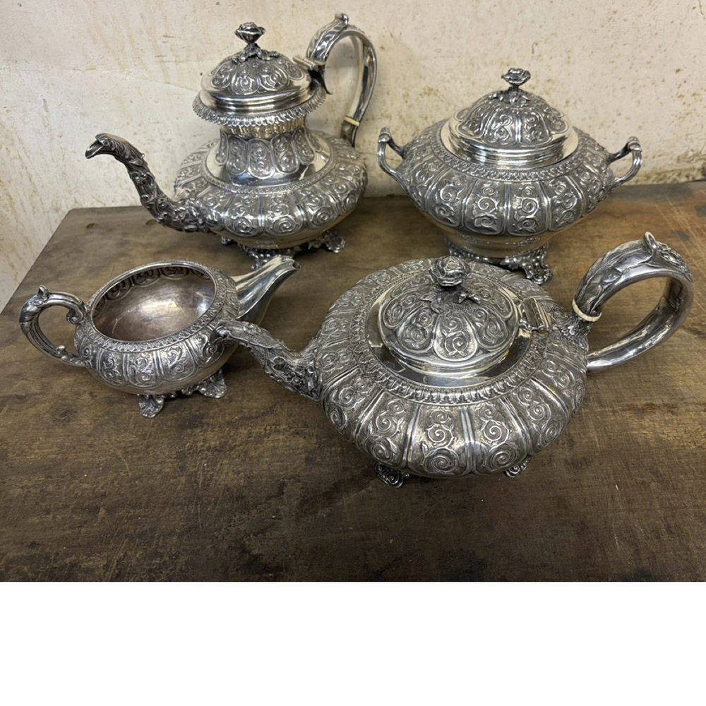 At Michael Bloomstein Precious Metals in London, this solid sliver tea and coffee service from 1824 and weighing 101 troy ounces was given a scrap value of $9423.21. Image Antiques Trade Gazette.
